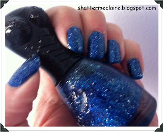So here is my other Scandal polish that I acquired while in Melbourne earlier in the year. Again yes it is a pretty corset bottle but it's not a fake Nfu-Oh. It doesn't say Nfu-Oh anywhere on it and just happens to be in a similar bottle. I really regret not buying more of these when I saw them but one day our paths shall cross again ... *crosses fingers*This is "Blue Pearl" and it's so pretty! It's full of silver and blue glitter chunks and this is swatched over one coat of Ulta3 Hollywood just so it matches the bottle slightly better. The silver glitter is slightly larger than the blue and there is a mix of light and dark blue glitter in there too.